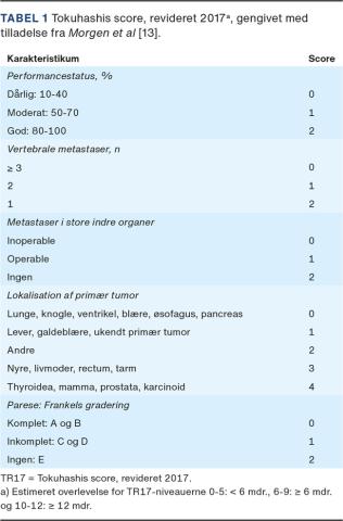 Valg af behandling foregår i et multidisciplinært samarbejde mellem onkologer, radiologer og rygkirurger. Vurderingen afhænger af flere faktorer, herunder almentilstand, grundsygdom, metastatisk udbredelse, neurologiske symptomer, komorbiditet og et estimat af forventet restlevetid [12, 13]. Der er udviklet prognostiske scoringssystemer til brug i beslutningsprocessen, f.eks. Tokuhashis score, som blev udviklet i 1990 og efterfølgende revideret i 2005 (TR5) og i 2017 (TR17) [13]. TR17 er baseret på performancestatus, primær kræftsygdom, antallet af vertebrale metastaser, metastaser i indre organer og neurologisk påvirkning gradueret fra paralyse til normal funktion (Tabel 1). TR17 er et beslutningsværktøj, der kan støtte klinikerne i at vælge den optimale behandling, da den forventede restlevetid er afgørende for, hvor radikal behandling patienter med MTS forventeligt kan have glæde af [3]. Anbefalingen har primært været at anvende kirurgi til patienter med forventet overlevelse på mere end tre måneder, men i praksis er det vanskeligt at estimere restlevetiden, og den bør generelt tillægges en mindre betydning [14].
