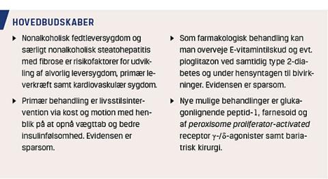 Patienter med NAFLD bør tilbydes hjælp til livsstilsintervention såvel som optimering af eventuel antihypertensiv, lipidsænkende og antidiabetisk behandling. Selvom statiner og metformin ikke afhjælper NASH, er der evidens for, at præparaterne modvirker udviklingen af HCC [8, 9]. Ansvaret for behandling af MS påhviler primært de alment praktiserende læger, og patienter, der har NAFLD med lav risiko for NASH/fibrose, bør følges og behandles i almen praksis.