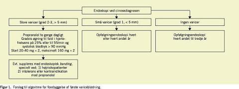 Ca. 50% af alle patienter med cirrose har varicer på diagnosetidspunktet. Derfor bør patienterne screenes for varicer ved diagnosen, således at profylaktisk behandling kan iværksættes, hvor den er indiceret. Primær profylakse er farmakologisk og/eller endoskopisk. Figur 1 er et forslag til algoritme for forebyggelse af første variceblødning.