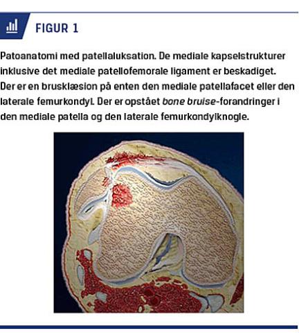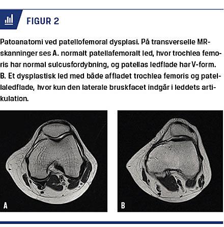 Patella lukserer stort set altid lateralt, hvorved de mediale kapselstrukturer overstrækkes, heriblandt det såkaldte mediale patellofemorale ligament (MPFL), som rumperer (Figur 1). Der er en øget tendens til reluksation, hvis patellafemoralleddet har dysplastiske forhold, og der er hyperlaksitet, højtstående patella (patella alta) samt valgusfejlstilling i knæleddet [2]. Ved patellafemoral dysplasi ses der affladet trochlea femoris med en reduceret trochleadybde og ændret form af patellas ledflade, så der i stedet for en V-form ses en mere flad konfiguration af patellas ledflade, hvor kun den laterale bruskfacet indgår i artikulationen (Figur 2). Dysplasi medfører en begrænsning af den ossøse og kartilaginøse stabilisering af patella under bevægeudslaget, og dette resulterer i en øget risiko for, at patella kan reluksere ved en ny overbelastning eller et traume. Et andet element ved dysplasi er at trochleas dybeste del er mere medialt placeret, og tuberositas tibia er lateraliseret. Det medfører en øget lateral trækvektor, når quadricepsmusklen aktiveres, og det bidrager til luksationstendensen. Patella alta er en kendt risikofaktor for gentagen patellaluksation, idet en proksimal patellaposition gør, at patella i ekstension og tidlig fleksion ikke stabiliseres i trochlea. Hos patienter med dysplasi er der således ikke bare øget risiko for luksation første gang, men særlig øget risiko for, at knæskallen kan reluksere. Efter patellaluksation ses der typisk en smertebetinget inaktivitet af vastus medialis obliquus og gluteus medius, hvilket bidrager til en ny funktionel patellainstabilitet i tiden umiddelbart efter en patellaluksation.