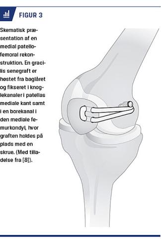 Den primære kirurgiske behandling er at genskabe MPFL, en såkaldt MPFL-rekonstruktion. Med rekonstruktionen tilføres en senegraft fra patienten, typisk en gracilis senegraft, som fikseres i den mediale patellakant og ved den mediale femurkondyl, svarende til MPFL-ligamentets naturlige forløb. En sådan rekonstruktion vil fungere som en »sikkerhedssele«, der sikrer patella mod en ny lateralisering [4]. I tilfælde af væsentlig dysplasi, f.eks. lateraliseret tuberositas tibiae, vil man her kunne korrigere den øgede trækvektor ved at medialisere tuberositas tibia ved en medialiserende tuberositas tibiae-osteotomi også kendt som Trillatoperation [5]. Her kan udmålinger af tuberositas lateralisering ift. det dybeste punkt af trochlea understøtte beslutninger om et sådant supplerende indgreb. Hvis der er patella alta, kan der foretages distaliserende tuberositas tibia-osteotomi, som ofte foretages som en kombineret medialiserende og distaliserende osteotomi.