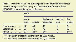 KOOS er et spørgeskema, som udfyldes af patienten selv. Det indeholder fem subkategorier: smerte, symptomer, almindelig dagligdags funktionsniveau, sport og fritidsaktiviteter samt knærelaterede livskvalitetsparametre. De enkelte subkategorier scores hver for sig [9]. Inden for hver subkategori opnås en score på 100% ved fravær af symptomer. Præ- og postoperative forskelle inden for subkategorierne af KOOS blev sammenlignet statistisk med Wilcoxon-Pratts test.