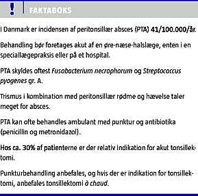Summary Treatment of peritonsillar abscess Ugeskr Læger 2012;174(6):340-343 Peritonsillar abscess (PTA) is associated with high morbidity and can cause serious and life-threatening complications. In Denmark, the most commonly isolated bacteria are Fusobacterium necrophorum and Streptococcus pyogenes gr. A. The incidence of PTA in Denmark is 41/100,000/year, the highest incidence ever reported for PTA. There is no definite consensus on the treatment. We recommend most patients treated with puncture and antibiotics as outpatients, and if necessary acute tonsillectomy instead of interval tonsillectomy. Steroids may be of value.