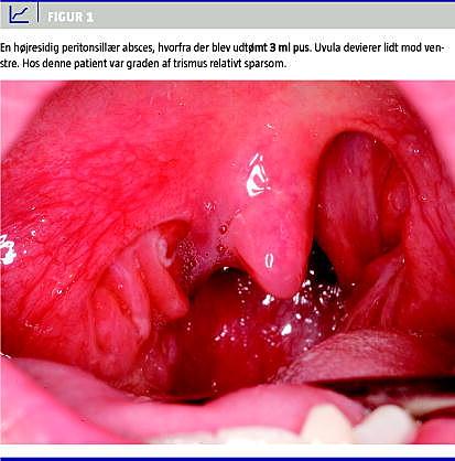 Peritonsillær absces (PTA) er den hyppigst forekommende dybe infektion i hoved-hals-området [1, 2] og er en komplikation i forbindelse med akut tonsillitis. PTA er en potentielt livsfarlig tilstand [1], der f.eks. kan medføre respirationsproblemer, udvikle sig til para- eller retrofaryngeal absces, nekrotiserende fasciitis, sepsis eller sprede sig ind i halsens karskede og forårsage Lemierres syndrom (septisk, metastaserende tromboflebitis af vena jugularis). PTA er forbundet med betydelig morbiditet. Danmark har muligvis verdens højeste incidens af PTA [3], og der mangler konsensus om behandlingen. Formålet med denne artikel er at udbrede kendskabet til sygdommen, sætte fokus på en alvorlig komplikation i forbindelse med tonsillitis og belyse evidensen for behandling.