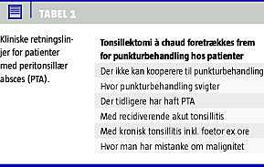 I litteraturen er der ikke fundet konsensus om eller god evidens for, præcis hvilken behandling der er den bedste [1, 9, 13, 14]. På specialafdelingerne i Danmark er der heller ikke et ensartet behandlingsregime. Der er dog konsensus om, at der skal skaffes akut afløb for abscessen. Behandlingen omfatter punktur med en kanyle og/eller stikincision med en kniv og evt. akut tonsillektomi (tonsillektomi à chaud ) eller tonsillektomi efter den akutte fase. Desuden antibiotika-, smerte- og væskebehandling. Man bør initialt bestemme sig for behandlingsregimet - enten tonsillektomi à chaud eller punkturbehandling, som kan foregå ambulant eller under indlæggelse (Tabel 1 ).