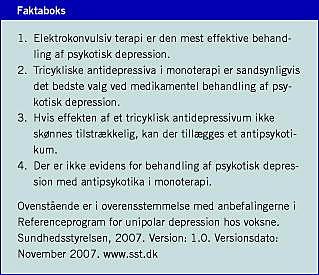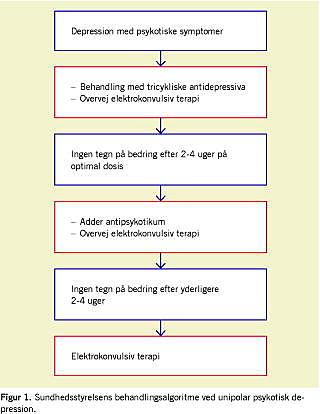 Behandling af psykotisk depression med ECT er bredt accepteret som »guldstandard« (se Figur 1 ) [3]. Der er endog nogle studier, der viser, at ECT er mere effektiv til behandling af psykotisk depression end til behandling af depression uden psykosesymptomer. Således viser et randomiseret nordamerikansk studie, at 95% af en gruppe patienter med psykotisk depression opnåede remission efter ECT-behandling mod 87% af en gruppe patienter med depression uden psykosesymptomer [8]. I den kliniske praksis indebærer behandling med ECT dog særlige overvejelser, idet denne behandling ofte er vanskelig at acceptere for patienten og de pårørende. Endvidere er ECT på kort sigt forbundet med flere udgifter end farmakologisk behandling. ECT-behandling er - ceteris paribus - forbundet med høj risiko for recidiv i månederne efter ophør, såfremt der ikke følges op med forebyggende antidepressiv behandling. Det er dårligt belyst, hvilket antidepressivum, der skal anvendes som profylaktikum efter ECT, idet der kun findes meget få og inkonklusive randomiserede undersøgelser til belysning af denne problemstilling, og studierne skelner ikke mellem psykotisk og ikkepsykotisk depression. Dette er særligt relevant for patienter med psykotiske depressioner grundet den større recidivrate [3]. Danish University Antidepressant Group (DUAG) påbegynder i løbet af 2008 en randomiseret undersøgelse angående profylaktisk behandling af depressive patienter efter ECT.