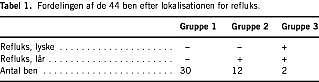 Tredive ben (68%) havde hverken refluks i lysken eller på låret, mens 12 ben (27%) havde refluks på låret, og to ben (5%) havde refluks både på låret og i lysken (Tabel 1 ).