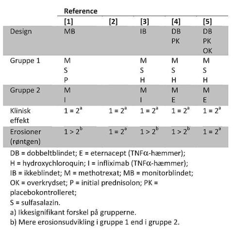 Sammenfattende viser de nævnte undersøgelser, at man kan opnå sammenlignelig klinisk effekt med kombination af konventionelle DMARD-præparater sammenlignet med biologisk behandling, mens virkningen på leddestruktionerne er mindre entydig.