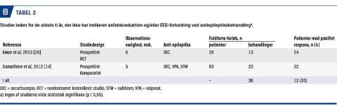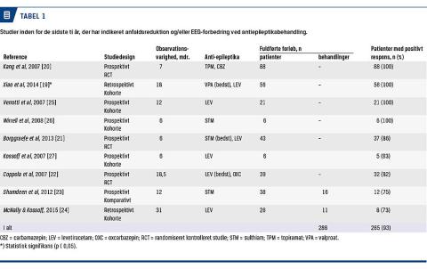 Ud fra vores opgørelse anbefalede man i ni af studierne (82%) [19-27] brug af AED for at opnå anfaldsreduktion og EEG-forbedringer, mens man kun i to (18%) [14, 28] talte imod. Flertallet af studierne tyder altså på, at AED-behandling giver anfaldsreduktion og EEG-forbedring. I flere studier har man sammenlignet behandling og ikkebehandling, men ingen af studierne er hverken placebokontrollerede eller dobbeltblindede [14, 23, 24, 28]. Af de hyppigst brugte AED (CBZ, OXC, VPA, STM, TPM og LEV) var det kun OXC, der ikke medførte større anfaldsreduktion og/eller EEG-forbedringer, end der var hos ubehandlede patienter [28].