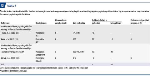 Flere studier omhandler behandlingseffekt af AED på den psykokognitive profil. I fem af disse sås der forbedring af symptomerne ved behandling [20, 21, 23, 24, 27] (Tabel 3 og Tabel 4). Kun to viste statistisk signifikans [20, 23]. I kontrast til disse studier viste to andre forringelse af de psykokognitive funktioner ved