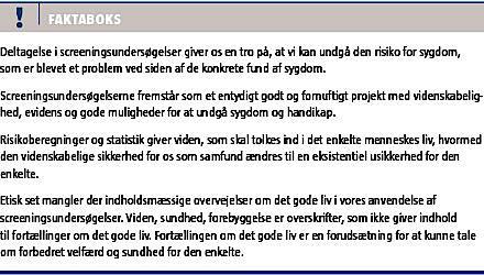 Ved screeningens hjælp får vi præsenteret det, der statistisk set er det sygdomsminimerede liv for hele befolkningen, men får vi også sundhed for alle, og det nødvendige indhold til visionen om det gode liv for den enkelte?