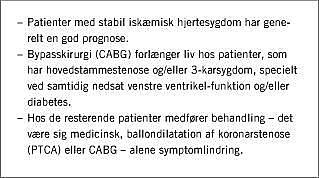 Patienter med stabil IHS har generelt en god prognose. CABG forlænger liv hos patienter med hovedstammestenose og 3-karsygdom, specielt ved samtidig nedsat venstre ventrikel-funktion og/eller diabetes. Hos øvrige patienter synes mortalitet og forekomst af ikkeletalt MI at være upåvirkelig af behandlingsvalget. Specielt hos patienter med 1-karsygdom er »den rigtigste« behandling diskutabel. Valget vil ofte være holdningsbaseret, og patienten bør som altid tages med på råd. Hvis patientens temperament er til det, og brystsmerterne kan behandles medicinsk, således at patienten oplever en tilfredsstillende livskvalitet, vil medikamentel behandling være et godt og skånsomt valg. Ønskes der hurtig AP-frihed og umiddelbar mindre medicinering, bør valget være PTCA. Prisen er imidlertid en relativt større risiko for, at et nyt invasivt indgreb inden for det første år bliver nødvendigt. Ønskes der maksimal opnåelig smertefrihed og mindre medicin, efter at »definitiv« revaskulariserende behandling er foretaget, kan CABG anbefales. Omkostningen er den operative morbiditet og mortalitet, der er knyttet til den enkelte patient og det enkelte hjertecenter.