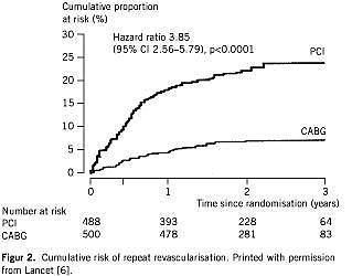 I en metaanalyse fra 1995 blev der inkluderet 3.371 patienter, hvoraf knap 80% havde flerkarsygdom [3]. Efter gennemsnitlig 2,7 års opfølgning fandtes der ingen forskel i forekomst af død eller MI mellem patienter, som blev behandlet med PTCA uden stent, og patienter, som gennemgik CABG. Behovet for nye invasive indgreb i det første år var imidlertid ti gange større efter PTCA (33,7%) end efter CABG (3,3%). BARI-undersøgelsens syvårsopfølgningsdata blev publiceret i 2000 [4]. I studiet inkluderede man 1.829 patienter med flerkarsygdom - heraf 64% med ustabil AP - og konstaterede en beskedent reduceret mortalitet ved brug af CABG versus brug af PTCA. Hos patienter med diabetes var den prognostiske gevinst ved CABG imidlertid signifikant.