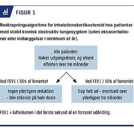 In 2012, The Danish Society of Respiratory Medicine gave birth to their most recent guideline regarding chronic obstructive pulmonary disease (COPD). Much has happened since, and in late 2017 an update has been published. Chapters have been deleted, and new ones added. The major alteration has been in the section concerning treatment with inhalation medication – now aiming at an easy stepwise up-titration of long-acting medicine as well as a guide of how to down-titrate inhaled corticosteroids. This article mainly focuses on how to treat stable COPD according to The Danish Society of Respiratory Medicine.