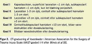 Levertraumer var tidligere forbundet med en meget betydelig mortalitet (50-60%) på grund af anbefaling af anatomiske leverresektioner [3, 13]. Derfor gik man i stigende grad over til at anbefale en mere »konservativ« behandling med initial perihepatisk pakning, Pringles manøvre, fingerfracture -eksponering af blødende steder og direkte ligatur samt nekrosektomier ved behov for leverresektion [1, 14]. Herved blev der opnået en betydelig sænkning af mortaliteten til 6-10% ved grad II-III leverlæsioner [3, 15, 16]. Med den stigende forståelse af, at blødningen i 70-80% af leverlæsionerne ophører spontant, og at den som oftest er af venøs oprindelse, har nonoperativ behandling initialt af lette [17] og senere også af sværere grader af leverlæsioner (AAST-grad III og IV) vundet indpas [6]. En forudsætning for den nonoperative behandling er udviklingen i CT, der har muliggjort en stadig mere nøjagtig klassificering af leverskaderne [8, 9, 12] og ført til en inddeling efter Mirvis (AAST) i fem grader [8] (Figur 2). Det har været fremført, at CT-gradueringen ikke havde den store overensstemmelse med den intraoperative graduering med ca. 40% såvel under- som overdiagnosticering [18, 19]. Imidlertid har CT-gradueringen en god overensstemmelse med den kliniske udvikling, specielt når der påvises arteriel blødning, og der er også en god korrelation til efterfølgende mortalitet [12, 20].