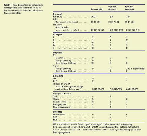 Resultater: I en toårig periode modtog vi konsekutivt 42 patienter med stumpe levertraumer, af hvilke 33 var svære (AAST-grad III eller mere). Syv patienter var allerede blevet laparotomeret andetsteds, af disse var fire pakkede, en splenektomeret, en sutureret i leveren og en nonterapeutisk laparotomeret. Af de resterende 35 patienter kunne 27 (77%) behandles nonoperativt. Hos ni (33%) af de nonoperativt behandlede patienter gav en CT mistanke om arteriel blødning, og de fik udført arteriografi (A-grafi), alle med efterfølgende transarteriel embolisering (TAE). To af disse fik cholascos og behandledes med drænage og endoskopisk retrograd kolangiografi (ERC). Otte (23%) af de primært modtagne patienter opereredes akut, efter at vi havde modtaget dem med terapeutiske tiltag. Dødeligheden for alle de patienter, der indgik i studiet, var fire (10%). Der var ingen dødsfald hos de nonoperativt behandlede.