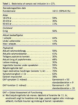 Syvogtyve konsekutivt henviste patienter blev inkluderet. Alle var behandlingskrævende, men behøvede ikke akut indlæggelse. Den psykiatriske skadestue modtog i inklusionsperioden i alt 423 patienter med suicidaladfærd; 368 af disse patienter kunne ikke indgå i projektet pga. eksklusionskriterierne. Otteogtyve personer ønskede ikke at modtage vurderings- og behandlingstilbuddet. De i projektet inkluderede patienter blev beskrevet ved indgangen i studiet i Tabel 1.