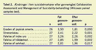Materiale og metoder: Syvogtyve suicidaltruede patienter, der var konsekutivt henvist fra psykiatrisk og somatisk skadestue, gennemgik et CAMS-forløb i en deskriptiv undersøgelse med kvalitative og kvantitative før- og eftermål. Formålet var at undersøge brugbarhed og effekt af CAMS-metoden på et dansk materiale. Fem væsentlige suicidalmarkører blev fortløbende vurderet (psykisk smerte, stress, indre uro, håbløshed og selvhad). Endvidere blev patienternes oplevelse af betydningen af de terapeutiske samtaler for eliminering af suicidaliteten og samarbejdet med terapeuten undersøgt.