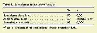 På en skala fra -3 til +3 svarer 80% af deltagerne bekræftende på (dvs. +2 eller +3), at alene de terapeutiske samtaler eliminerede suicidaliteten (Tabel 3). Hele 92% gav udtryk for at have oplevet en høj eller meget høj grad af samarbejde. For 40% spillede andre faktorer også en rolle. 92% af alle planlagte samtaler blev gennemført. Det gennemsnitlige antal samtaler var seks (maksimum 12 og minimum tre). Tre patienter (11%) afbrød terapien præmaturt.