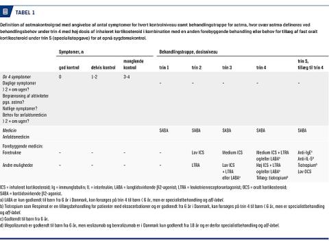 Svær astma er en selvstændig fænotype, der defineres i overensstemmelse med internationale guidelines [3] ved behov for højdosis-ICS i kombination med anden forebyggende behandling, f.eks. langtidsvirkende β2-agonist og/eller behov for fast oralt kortikosteroid (OCS) for at opnå sygdomskontrol (Tabel 1) [4]. Denne definition forudsætter, at diagnosen er korrekt, og at andre årsager til dårlig astmakontrol, såsom dårlig adhærens, triggerfaktorer (f.eks. tobaksrøg og allergener) og komorbiditeter (f.eks. rinitis, nasalpolypper, overvægt, refluks og angst), er identificeret og korrigeret [3]. Svære astmasymptomer, dvs. dårligt kontrolleret astma, må ikke forveksles med svær astma, hvorfor systematisk udredning er afgørende for at definere subgruppen, der har svær astma [5].