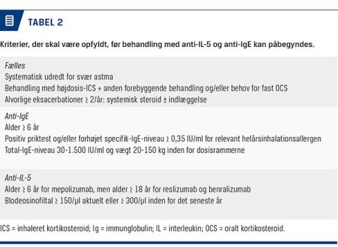 Lægemidlerne er indiceret som tillægsterapi til patienter, der har svær astma, er systematisk udredt og opfylder kriterierne i Tabel 2.