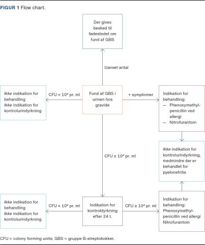 GBSuri er forekomst af GBS i urinen uanset antallet af bakterier og uden symptomer på UVI. Asymptomatisk bakteriuri med GBS (GBSASB) defineres i Danmark som GBSuri med CFU ≥ 104 pr. ml ved to konsekutive urindyrkninger med > 24 timers interval (Figur 1) uden samtidige symptomer på UVI [4] og ses hos 2-7% af de gravide [1, 6, 7].