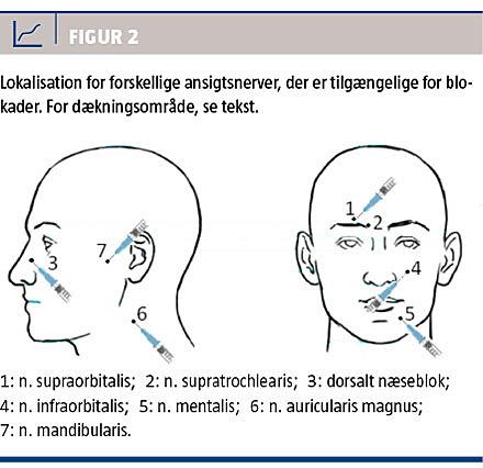 planlægges derfor før anlæggelse af lokalanalgesi, og eventuelle landmærker markeres. Ved anlæggelse af blokade undgår man disse påvirkninger i direkte relation til såret. Blokader har derfor deres berettigelse [4] på trods af, at man i et randomiseret studie af fra 2005 med 36 patienter påviste signifikant mere smerte ved anlæggelse af regionalt blok end lokal infiltrationsanalgesi ved sutureringskrævende ansigtsskader. Desuden var det oftere nødvendigt at supplere i gruppen med regionalblokade (28% mod 0%, p = 0,04) [5]. Ved større skader på pande, øre og læbe kan blokade anvendes, særligt i situationer hvor konturspring ønskes undgået, f.eks. en skade som krydser læbens vermillion border (Figur 1).