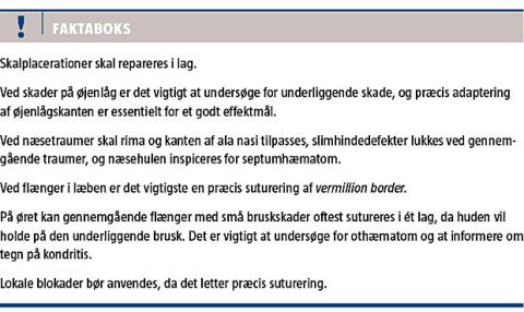Ved behandling af traumatiske ansigtsskader kan man med kendskab til få principper opnå et godt kosmetisk og funktionelt resultat. Skalplacerationer skal lukkes igennem alle lag. Skader på øjenlåget kræver grundig øjenundersøgelse. Det vigtigste er præcis adaptation af øjenlågskanten. Nasalt septumhæmatom skal evakueres og kontinutet af rima samt ala nasi er vigtigt for resultatet. Bruskdække på både slimhinde- og hudside er obligatorisk. Nøglen til det bedste resultat af læbeskader er præcis tilpasning af vermillion border. Øreskader kan som regel lukkes udelukkende med suturer i huden, da den stramme hud holder brusken på plads. Generelt gælder, at behandling af patienten bør konfereres med en specialist ved mistanke om skade på dybereliggende strukturer, såsom nerver (særligt facialis), ductus paroticus, tåreapparatet, traumatiske lacerationer med substanstab eller amputationsskade af næse eller øre.