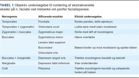 Den objektive undersøgelse bør som minimum bestå af en systematisk gennemgang af ansigtets muskelgrupper og n. facialis’ nervegrene (Tabel 1). Undersøgelsen kan foregå ved at bede patienten om at løfte øjenbrynene, rynke panden, knibe øjnene sammen, smile med og uden at vise tænder, blæse kinderne op mod modstand, spidse munden og vise tænder i undermunden.