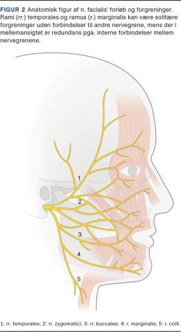 Rr. temporales i øvre ansigt og r. marginalis i nedre ansigt læderes oftest ved ansigtsskader, da nervegrenene har et superficielt forløb og kan være solitære uden interne forbindelser til andre nervegrene (Figur 2) [7, 8]. Læsion af rr. temporales forårsager ipsilateral øjenbrynptose og en udglattet pande (Figur 3A). Skade på r. marginalis vil medføre en lammet underlæbe, som ikke kan trækkes ned og vise tænder ved smil, og som er udsat for bid fra patientens tænder (Figur 3B) [8].