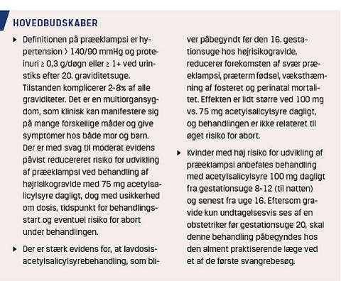 Acetylsalicylsyre 100 mg dagligt (til natten) anbefales fra GA 8-12 uger og senest GA 16 uger til kvinder med høj risiko for udvikling af præeklampsi, da det forebygger udvikling af svær præeklampsi, væksthæmning af fosteret, præterm fødsel og perinatal død. Formentlig har højrisikogravide fordel af behandling med acetylsalicylsyre allerede fra opdaget graviditet, og da der ikke er fundet øget risiko for abort, kan dette blive en mulig fremtidig anbefaling.