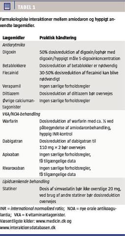 Forud for behandling med amiodaron bør fordele og ulemper nøje overvejes, herunder de potentielt alvorlige bivirkninger. Amiodaron interagerer med en række lægemidler, og det er ofte nødvendigt med justeringer af patientens øvrige medicin. De vigtigste lægemiddelinteraktioner er nævnt i Tabel 1 [14, 15]. I et studie har man dokumenteret, at samtidig behandling med amiodaron og warfarin giver en 2-3 gange forøget risiko for indlæggelse med intracerebral blødning inden for 30 dage sammenlignet med risikoen hos patienter, der alene er i warfarinbehandling [16]. Hyppige målinger af international normalized ratio er vigtige, og warfarindosis vil oftest skulle reduceres med 6-65% [15]. En dosisreduktion på 30-40% anbefales allerede i forbindelse med påbegyndelsen af amiodaronbehandlingen. Ved anvendelse af en anden K-vitamin-antagonist, phenprocoumon,