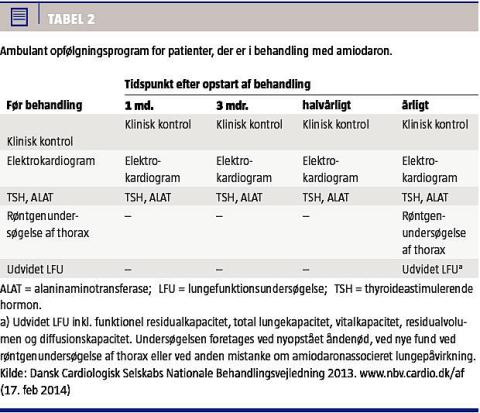 Pga. amiodarons farmakokinetik påbegyndes behandling ofte med et støddosisregime på 400-600 mg × 2 dagligt indtil mætningsdosis på 10 g er nået, hvorefter patienten gradvist overgår til vedligehol-delsesdosis på 100-400 mg dagligt [11, 12]. Ved samlede døgndoser over 800 mg bør behandlingen indledes under telemetriovervågning. Efter behandlingsstart er ambulant opfølgning nødvendig med rutinemæssig måling af thyroideastimulerende hormon (TSH) og levertal samt optagelse af elektrokardiogram. Efter seponering af amiodaron bør der måles stofskiftetal halvårligt i 18 måneder, idet præparatet akkumuleres i organismen og også sent i forløbet kan give organpåvirkning, herunder særligt thyroideapåvirkning [18]. Et eksempel på et opfølgningsprogram fremgår af Tabel 2.