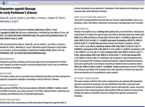 Cochrane-analysen, Dopamine agonist therapy in early Parkinso'ns disease , er en systematisk gennemgang af den foreliggende litteratur, som omhandler behandling med DA i den tidlige fase af PS. Formålet med meta-analysen var at kvantificere både den kliniske og økonomiske effektivitet af DA som lægemiddelgruppe i forhold til placebo eller LD.