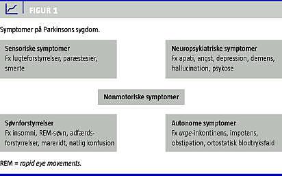 Bortset fra de motoriske kardinalsymptomer er adskillige nonmotoriske deficit (Figur 1) en væsentlig del af fænotypen ved PS, og disse påvirker livskvaliteten i varierende grad. Flertallet af de inkluderede studier har imidlertid brugt motoriske outcome-parametre som primære effektmål. På UPDRS er f.eks. de motoriske parametre overrepræsenterede, mens behandlingseffekten på de nonmotoriske problemer ikke registreres tilstrækkeligt.