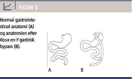 Ved Roux-en-Y-gastrisk bypass (RYGB) ændres fødens vej gennem mave-tarm-kanalen, så den proksimale del af tyndtarmen bypasses (Figur 1). RYGB er associeret med betydeligt vægttab [4, 10], som typisk stabiliseres 1,5-2 år efter operationen [4]. Langtidsstudier af op til 20 års varighed tyder på vedvarende effekt [11]. Endvidere ses der typisk forbedring og i mange tilfælde normalisering af glukosestofskiftet hos patienter med type 2-diabetes. Afhængigt af definitionen er der rapporteret om remissionsrater på mellem 40% [12] og 80% [10]. Trods de kort- og langsigtede fordele ved RYGB er indgrebet forbundet med komplikationer (i randomiserede studier fik > 20% af de RYGB-behandlede patienter komplikationer [4]), der kan være irreversible og potentielt dødelige. I en metaanalyse fra 2004 rapporteredes der om en 30-dagesmortalitet på 0,5% [10], og i en nyere metaanalyse var 30-dagesmortaliteten i randomiserede studier og observationelle studier opgjort til henholdsvis 0,08% og 0,38% [4]. I Danmark var dødeligheden i perioden 2006-2011 på samme niveau, 0,49% [13]. På kort sigt er tromboemboliske samt hjerte- og lungekomplikationer de hyppigste dødsårsager efter RYGB [14]. Herudover er en række