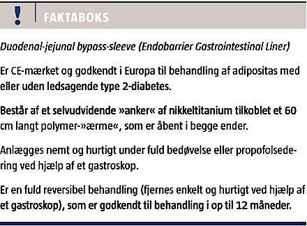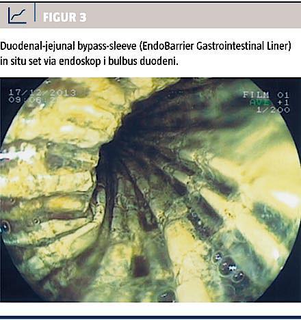 I 2010 blev EndoBarrier Gastrointestinal Liner godkendt i Europa (CE-mærket) til behandling af overvægt. EndoBarrier Gastrointestinal Liner består af et selvudvidende nikkeltitaniumanker og et 60 cm langt impermeabelt »ærme« lavet af fluoropolymer (Figur 2 og Figur 3). EndoBarrier Gastrointestinal Liner, der er åben i begge ender, placeres ved hjælp af et gastroskop samt et over the wire-system i den proksimale del af tyndtarmen (Figur 4). Proceduren kan foretages under propofolsedering, og ukomplicerede anlæggelser tager ca. 20 minutter. Det selvudvidende anker fikseres til tarmvæggen i bulbus duodeni ved hjælp af små nikkeltitaniumpigge, der borer sig få mm ind i tarmens mucosa [16]. Indtaget føde passerer fra mavesækken videre ned igennem »ærmet« (Figur 4). Fordøjelsessaft fra pancreas og galde udskilles naturligt til tarmen og løber videre ned imellem »ærmet« og tarmvæggen. Ved den distale ende af »ærmet« ved jejunum blandes den ufordøjede føde med fordøjelsessaft og galde [17]. Producenten af EndoBarrier Gastrointestinal Liner, GI Dynamics Inc., Boston, MA, USA, anbefaler, at DJBS-behandling ledsages af kostvejledning for at optimere effekten og mindske risikoen for komplikationer. Således skal kosten være flydende i den første uge efter anlæggelsen af DJBS, pureret i uge to og derefter bestå af en normal sund kost med fravalg af trevlede fødevarer som f.eks. asparges og rabarber. Efter 12 måneder (eller før hvis patienten ønsker det, f.eks. ved bivirkninger) fjernes EndoBarrier Gastrointestinal Liner endoskopisk. Dette sker under propofolsedering ved hjælp af en beskyttelseshætte til det sammenklappelige anker.