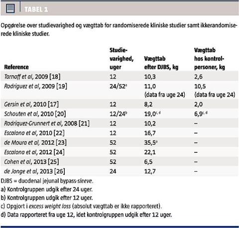 De vægttabsmæssige resultater fra fire randomiserede kliniske studier og seks observationelle studier synes at være lovende, dog mindre end ved f.eks. RYGB. Derimod taler DJBS-procedurens mindre invasive karakter, forbigående bivirkninger og reversible natur for en mulig fremtidig plads som regelret behandlingstilbud i Danmark.