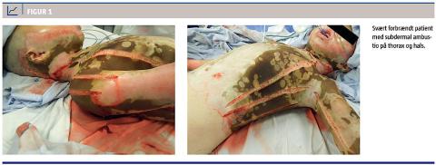 legemsoverflade (total body surface (TBS)) – ses kun lokal ødemdannelse. Derimod ses der en systemisk ødemdannelse ved brandsår > 10% af TBS, hvilket kan medføre hypotension, lungeødem, samt akut tubulointerstitiel nefropati [2-5]. Ved det cirkulære eller næsten cirkulære subdermale ambustio hindres ekspansion af den underliggende subcutis pga. den hårde ueftergivelige beskadigede hud (eschar’et).