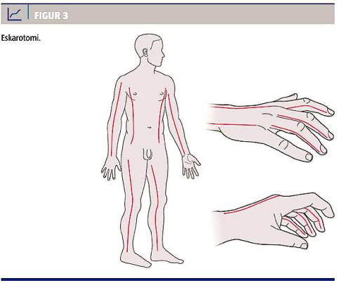 Hos patienter med symptomer på truende eller manifest brandsårsinduceret tourniquet er der indikation for eskarotomi. Der foretages incisioner til subcutis med skalpel, hvilket muliggør ekspansion af subcutis og dermed en dekompression af de underliggende strukturer [2]. Incisionen skal kun være til subcutis og ikke til fascieniveau; evt. kan man holde en finger på knivsbladet under udførelsen, så det begrænses, hvor dybt der incideres (Figur 2). Eskarotomier på thorax og abdomen anlægges langs den forreste aksillinje fra klavikelniveau til kurvaturen (Figur 3). Eventuelt anlægges der også en transversal incision anteriort på diafragmaniveau. Herefter vurderes effekten ved normalisering af blæretryk, diurese, blodtryk, respiration etc. På halsen anlægges eskarotomierne posteriort for sternokleiden for at undgå de større kar. På over- og underekstremiteterne anlægges de medialt og lateralt. På hånden anlægges de langs palmarfolden og på håndryggen mellem metacarpi. På fingrene anlægges de medialt og lateralt i neutrallinjen for at undgå sener, kar og nerver dorsalt og volart [2, 3] (Figur 3).