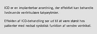Risikoen for arytmi er relateret til nedsat systolisk funktion af venstre ventrikel og stigende grad af hjerteinsufficiens [15]. Implantation af ICD er effektiv i behandlingen af livstruende arytmier, men effekten på totalmortaliteten reduceres pga. dødeligheden som følge af hjerteinsufficiens. Man kunne således forestille sig, at der kun ville være en beskeden prognostisk gevinst ved ICD-behandling af patienter med svær venstre ventrikel-dysfunktion. Imidlertid syntes denne gruppe patienter at have den største gevinst af behandlingen.