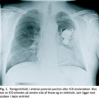 En implanterbar cardioverter defibrillator (ICD) er en særlig avanceret pacemaker, som kan foretage kardiovertering (afbryde ventrikulær takykardi med elektrisk stød), defibrillering (afbryde ventrikelflimren med elektrisk stød) eller takykardibrydende pacing ved ventrikulære takyarytmier og konventionel pacing ved bradyarytmier [1]. Enheden placeres subkutant eller submuskulært på thorax, og en særlig defibrilleringselektrode føres transvenøst til højre ventrikels apex (Fig. 1 ). Den perioperative mortalitet er minimal. Implantationen kan kompliceres af hæmatom, pneumothorax og elektrodedisplacering og på længere sigt af infektion og utilsigtet terapi. ICD-enheden holder i seks år, elektroderne holder betydeligt længere.