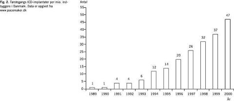 Den første ICD blev indopereret på en patient i 1980 i USA, og den første ICD-implantation i Danmark blev foretaget på Skejby Sygehus i 1989. På verdensplan bliver der årligt implanteret ca. 60.000 ICD-enheder, heraf ca. en tredjedel i USA. I Danmark fik 239 patienter implanteret ICD i 2000, og dermed var der ved slutningen af 2000 i alt 885 patienter i behandling med ICD, heraf var 81% mænd (www.pacemaker.dk). Grundsygdommen var iskæmisk hjertesygdom hos 59%, kardiomyopati hos 18% og andre årsager hos 23%. Antallet af ICD-implantationer stiger såvel på verdensplan, som i Danmark (Fig. 2).