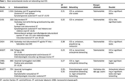 Siden den første publikation i Ugeskrift for Læger om behandling med ICD [2] er resultaterne fra en række randomiserede studier af gevinsten ved ICD-implantation blevet offentliggjort. I det følgende beskrives seks store kontrollerede, randomiserede studier, hvori man har undersøgt fordelene ved ICD-implantation som førstevalgsbehandling til højrisikopatienter (Tabel 1 ).