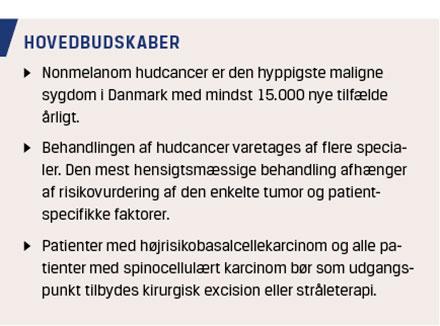kirurgisk og nonkirurgisk. Valg af behandlingsmetode afhænger af tumortype, -størrelse, -dybde og -lokalisering samt patientspecifikke faktorer og forventninger til det kosmetiske og funktionelle resultat. Behandlingen varetages af flere specialer, herunder almen praksis, dermatologi, plastikkirurgi og onkologi. For at opnå det bedste resultat er det vigtigt, at patienten får den optimale behandling fra diagnosetidspunktet. Formålet med denne artikel er at skabe et overblik over de tilgængelige behandlingsmodaliteter og dermed udarbejde en henvisnings- og behandlingsalgoritme for BCC og SCC. Sjældne hudcancere og modermærkekræft samt forstadier hertil omtales ikke her.