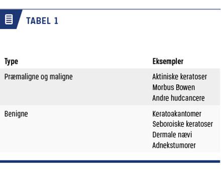 Ved mistanke om hudcancer bør man notere sig lokalisering, størrelse, vurderet tykkelse, varighed og ændringer i elementet. Diagnosen stilles ved biopsi eller på andet udtaget adækvat materiale. Undtagelse herfra bør kun ske hos patienter med multiple tumorer, som klinisk ligner hinanden. Her kan en biopsi fra en repræsentativ tumor være sufficient. Differentialdiagnoser til hudcancer omfatter både maligne, præmaligne og benigne forandringer (Tabel 1).