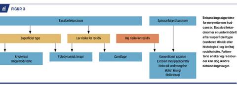 Behandlingsalgoritmen tager udgangspunkt i tumortype og høj-/lavrisikofaktorer (Figur 3). Patientens ønske, komorbiditet, funktionsniveau og bivirkninger af behandlingen kan have indvirkning på behandlingsvalget. Det er vigtigt for behandlingen, at patienten kan overholde evt. postoperative restriktioner eller være indstillet på de gentagne behandlinger, som f.eks. strålebehandling indebærer. Ligeledes kræves der god komplians ved imiquimodbehandling, idet det indebærer daglige påsmøringer over flere uger. Fordele og ulemper ved de forskellige behandlingsmodaliteter bør tilpasses den enkelte persons ønsker og ressourcer. Det vigtigste er at finde den behandlingsmodalitet, der for den enkelte patient giver størst mulighed for helbredelse med de færreste risici under hensyntagen til patientens ønsker.
