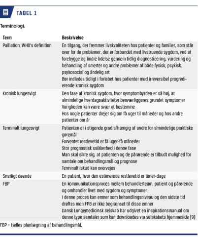 Kun 5% af de patienter, som i Danmark får tilbud om højt specialiseret palliativ indsats er nonmalignt syge, på trods af at patienter med nonmalign sygdom i den terminale fase gennemlever lige så stor lidelse, som kræftpatienter gør [6, 7]. Kommunikation er central i kontakten med patienter med kronisk fremadskridende sygdom. Patienter og pårørende har brug for information om deres prognose samt om behandlings- og plejetiltag i alle sygdomsfaser [8]. Sundhedsstyrelsen anbefaler rutinemæssige samtaler med patienter om deres håb og frygt for fremtiden herunder om behandlingsniveau. Denne type samtaler kaldes advance care planning. Dansk Lungemedicinsk Selskab (DLS) har udgivet en praktisk inspirationsmanual, som kan downloades via DLS’ hjemmeside til denne type samtaler, som på dansk kaldes fælles planlægning af behandlingsmål (FPB) (Tabel 1) [9].