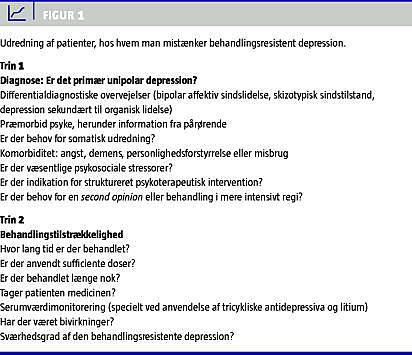 Ved mistanke om BRD anbefales en totrinsmodel [9]: Først vurderes faktorer, som kan forklare det manglende respons, f.eks. komorbide tilstande (Figur 1 , trin 1). I klinisk praksis er forkert diagnose en hyppig årsag til formodet BRD. Så det anbefales at revurdere diagnosen og forløbet, gerne ved anvendelse af et struktureret psykiatrisk interview. Dette kan involvere henvisning til second opinion -vurdering, f.eks. ved ambulant specialafsnit eller ved indlæggelse. Somatisk anbefales bred udredning afhængig af de specifikke klager, alder og anamnese (blodprøvescreening, somatisk medicin, bivirkningsprofil, farmakologiske interaktioner, indikation for billeddannede diagnostisk af cerebrum, computertomografi eller magnetisk resonans-skanning).
