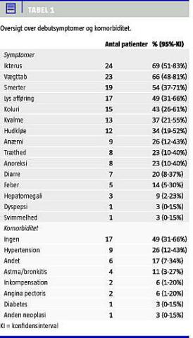 I alt 35 patienter (20 mænd, 15 kvinder) blev diagnosticeret og behandlet for papilcancer i inklusionsperioden. Gennemsnitsalderen på diagnosetidspunktet var 66 år (median 65,0 år; spændvidde 41-81 år). Ikterus, vægttab og smerter var de hyppigst forekommende symptomer på henvisningstidspunktet (Tabel 1 ), og hovedparten af patienterne (86%) havde to eller flere symptomer. Tretten patienter havde betydende komorbiditet (American Society of Anesthesiologists' physical status (ASA) tre eller fire), mens 22 patienter havde ingen eller beskeden komorbiditet (ASA et eller to).